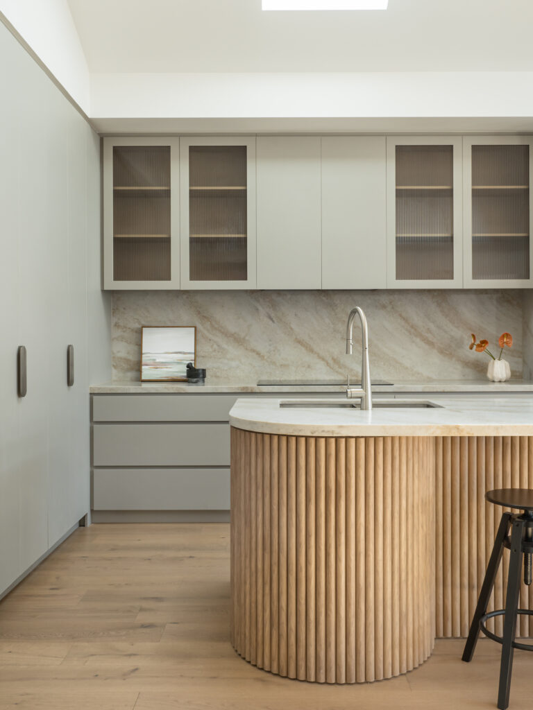 A modern kitchen featuring a fluted wooden island, a marble backsplash, and light-coloured cabinetry.